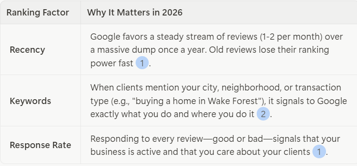 In the age of AI search, your Google reviews are doing double duty. Not only do they help you rank in the local "3-pack" on Google Maps, but they also feed the AI models that recommend you to potential clients. When someone asks ChatGPT or Perplexity, "Who's the best realtor in Raleigh for first-time buyers?", those AI tools are scanning your reviews for specific keywords and recent activity .